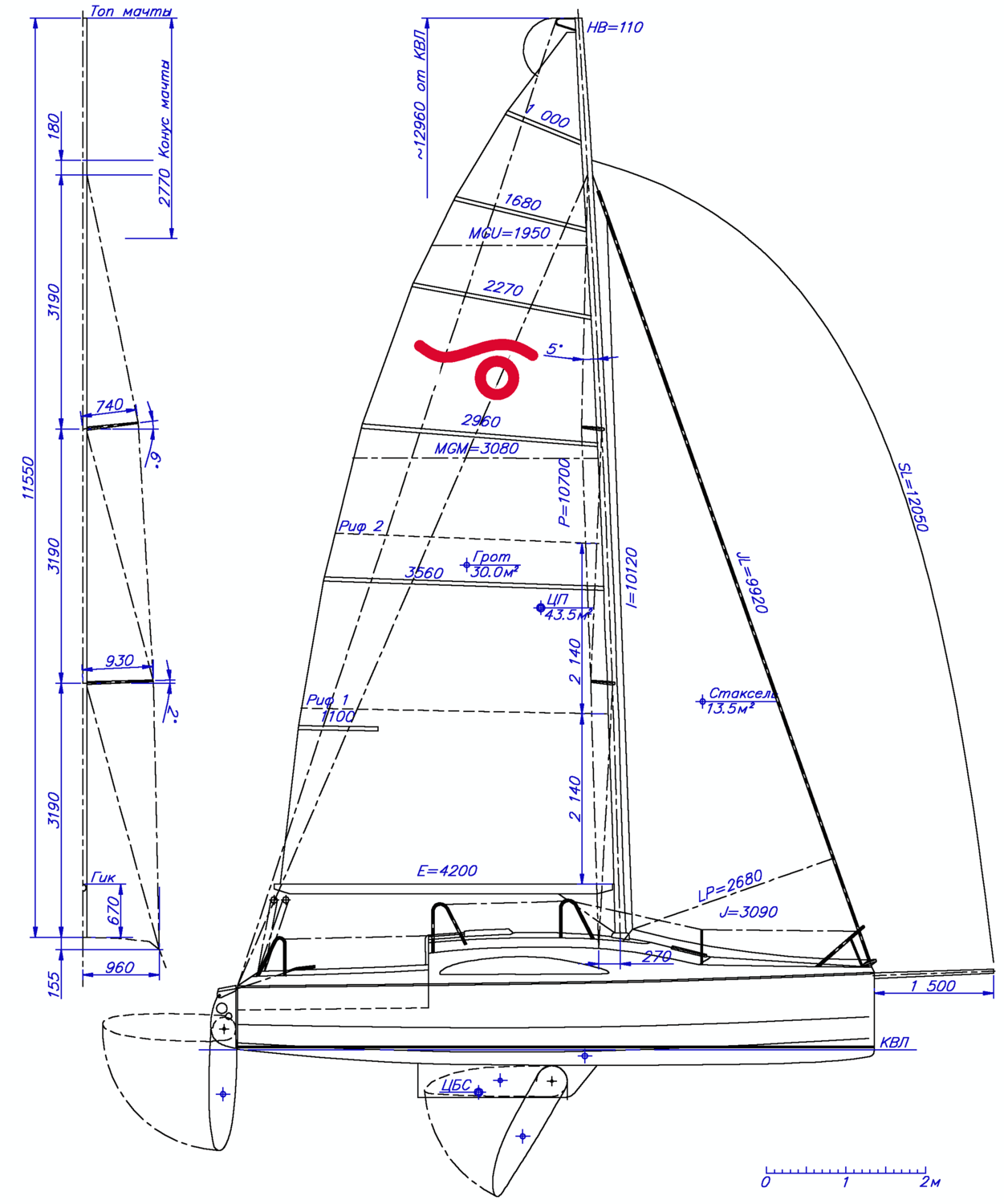 Такой набор делает яхту быстрой, особенно на полных курсах и слабом ветре. Это типичный спортивный подход, но без излишних усложнений.