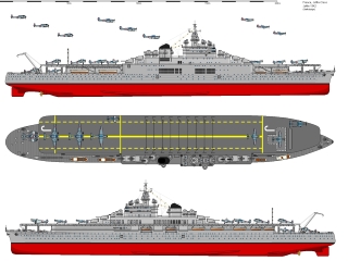 Авианосец был оснащен двумя подъемными механизмами, необходимыми для подъема и спуска самолетов, а также был оборудован пространствами для обслуживания авиации, складами и ангаром. Ожидалось, что корабль будет оснащен взлетно-посадочной полосой, которая позволяла бы самолетам взлетать и садиться в условиях ограниченной дальности.