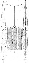 Между корпусами располагалась лёгкая платформа. На чертеже видна сложная система ребер жёсткости и центральный каркас — место установки мачты и узлов крепления рангоута.