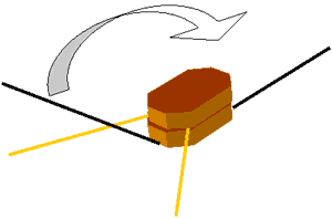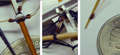 Заготавливается необходимое количество щек. Затем подготавливается нить, имитирующая снасть. Если под рукой нет специальной нити, по толщине соответствующей масштабу модели (от использования лески, волос, полимерного волокна я после определенного количества опытов отказался) то ее можно изготовить следующим способом: от катушки капроновой нити соответствующего цвета отрезается отрезок длиной 10-15 см. Нить распускается на пряди - их обычно 2-3. Для того, чтобы прядь стала ровной, ее надо термически обработать - нагреть в натянутом состоянии над электрической плиткой. Это очень тонкая процедура: необходимо уловить момент , когда волокна пряди начинают плавиться, слегка растягиваться и слипаться между собой, но не передерживать над плиткой, иначе прядь порвется. Это достигается подбором расстояния над плиткой и ее температурой. Теперь непосредственно процесс изготовления блока. Заготовка щеки ложится внутренней стороной вверх, кончик пряди обмакивается в клей (я применяю цианакриловый суперклей в маленьких тюбиках) и приклеивается к щеке, аналогично приклеивается вторая прядь - таким образом имитируется снасть, продеваемая в блок. Если имитируется блок талей или горденей, то приклеивается три нити, средняя из которых имитирует коренной конец, а две боковые - ходовой. Затем сверху приклеивается другая щека, таким образом получается блок с продетой снастью ( Рис.3).