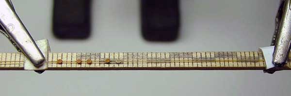 И наконец об изготовлении талей и горденей. Для того, чтобы изготовить несколько талей одного размера, я укрепляю в зажимы <третьей руки> отрезок шкалы деревянной линейки. На шкалу укладываю параллельно две пряди, располагая их на расстоянии чуть меньшем, чем ширина блоков и прижимаю зажимами <третьей руки> к самой шкале. Для этого между <крокодильчиками> и шкалой помещаю кусочки картона. Затем между прядями и шкалой помещаю заранее заготовленную щеку блока, наношу каплю клея и сверху накрываю второй. На необходимом расстоянии от первого блока аналогичным способом изготавливается второй блок, затем на этих прядях так же делаются остальные тали. После этого <гирлянда> разрезается на отдельные тали. Осталось, как и в первом способе, обровнять торцы, ввязать блоки в стропы и снасти, укрепить при необходимости сборку клеем и закрасить торцы под цвет блоков.