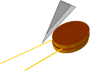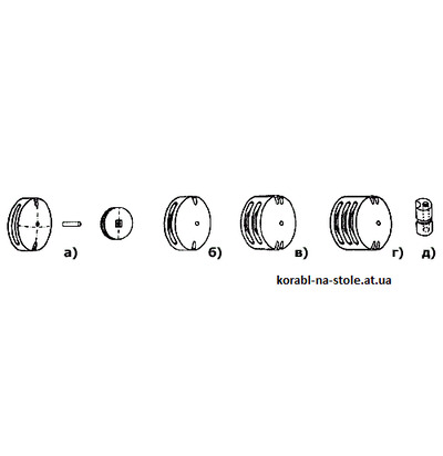 2. Суть второго способа заключается в том, что щеки блока не вырезаются из узкой полоски, а изготавливаются с помощью специальной выколотки. Последняя сделана из иглы от капельницы соответствующего диаметра : наклонное острие спиливается, а торец затачивается. Выбитые таким несложным девайсом кружки ватмана или шпона выталкиваются из иглы с помощью тонкой проволоки и служат <полуфабрикатом> для изготовления щек. Как и в первом способе, на них наклеиваются пряди снасти, сверху приклеивается еще один кружок, затем изделию придают форму блока, срезая с боков излишки (Рис. 5).