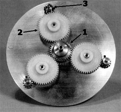 1 - центральная шестеренка; 2 - промежуточные шестеренки; 3 - шпиндельные шестеренки