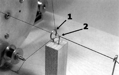 От колец этих трех шпинделей нити сходятся перед центром головки примерно в 5 см от нее. Здесь они пропускаются через большое кольцо, малое колечко и затем готовый трос идет через направляющее ушко к катушке натяжного приспособления. Эти два кольца - ключи к станку. Поскольку напряжение нитей никак не регулируется и достаточно только для того, чтобы держать их в натяг, чрезвычайно трудно гарантировать их равномерное натяжение. Если одна нить имеет большее натяжение чем другие, она станет основной нитью, вокруг которой другие будут накручиваться вместо того, чтобы все три нити накручивались совместно. Лучший путь преодолеть этот эффект в том, чтобы переместить точку натяжения нити. Это и есть цель двух колец.