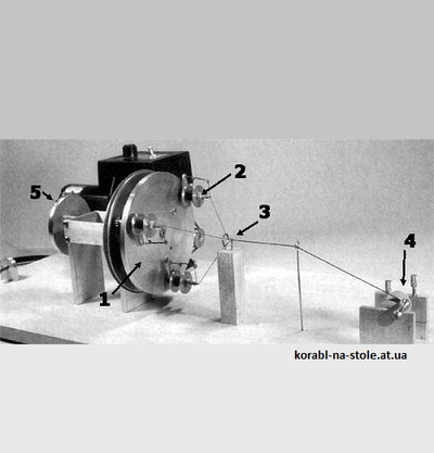 Фото 1. Мотор вращает головку, которая поворачивает три шпинделя. Нити из катушек соединяются в трос в малом колечке и он (трос) наматывается на катушку натяжного приспособления.