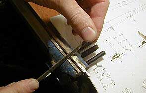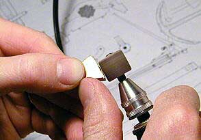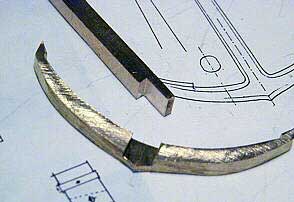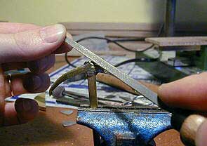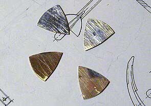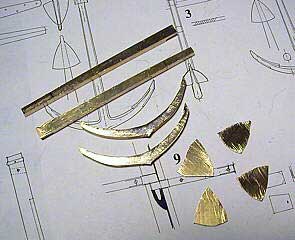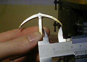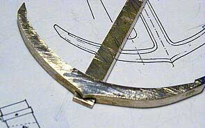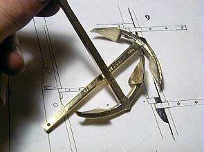 Различные детали якоря вырезаем на электролобзике из листовой латуни. В данном случае для веретена и рогов использована латунь толщиной 4 мм, а для лап латунь толщиной 1 мм. |