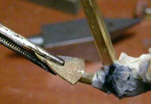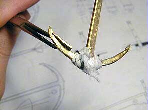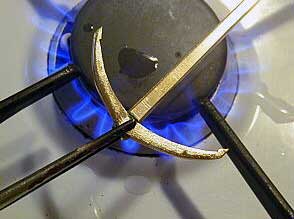 Складываем все четыре лапы якоря вместе и между ними помещаем небольшую капельку олова. Нагреваем на газовой плите и сильно сжимаем. |