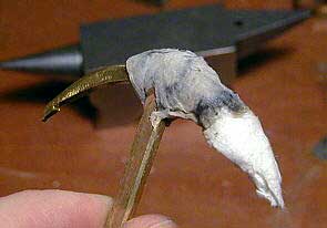 Проблема: когда мы будет нагревать лапы и конец рога для их спайки, латунь, которая очень хорошо проводит тепло, нагреется и стык веретена отпаяется. Для решения этой проблемы обматываем стык веретена и рогов мокрой тряпкой или туалетной бумагой. |