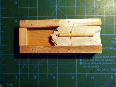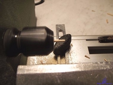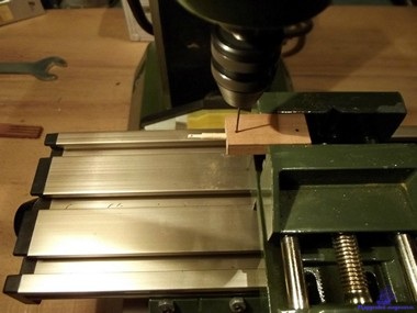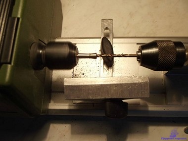 При изготовлении лафетов встала проблемка, как в осях диаметром 1 мм просверлить отверстие под клин диаметром 0,5 мм. Надо просверлить 64 шт. отверстий и не сломать сверло. Из брусочка изготовил такой кондуктор: