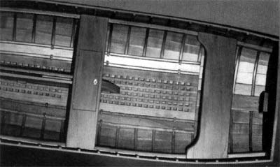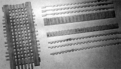 Все детали для решеток палубных люков можно сделать на небольшом токарном станке по металлу, оборудованном фрезерными тисками, которые превращают станок во фрезерный, подходящий для точной обработки большинства деталей модели. Поскольку элементы решетки перпендикулярны друг другу, то нужно сделать как продольные, так и поперечные заготовки реек. Но, поскольку сетка решетки квадратная, то обе заготовки одинаковые, только различаются по длине. Необходимый шаг решетки в данном случае составлял 3 мм, а бур был только 1 мм вместо нужных 1,5 мм. Пришлось пойти на хитрость. Установка для изготовления первого этапа заготовок для решеток показана на фото 1. Сначала был сделан первый вертикальный проход путем перемещения фрезерных тисков в вертикальной плоскости. Обратите внимание, что в тиски зажат ненужный кусок дерева, а заготовка приклеена к нему на двухстороннем скотче. После первого прохода поперечной подачей токарного станка тиски с заготовкой были смещены на 0,5 мм и сделан второй проход. Это дало необходимую ширину паза - 1,5 мм. Затем поперечной подачей тиски вновь сдвинулись на 2,5 мм и вся процедура повторилась. Сделав таким образом необходимое количество поперечных пропилов, получили готовую заготовку для второго этапа. Далее нужно было разрезать заготовку вдоль на пластины толщиной ровно 1,5 мм. Здесь был применен алмазный диск на оправке, зажатой в патрон станка. В тиски была зажата толстая доска с латунной пластиной, край которой точно перпендикулярен оси стакана. Этот край использовался как упор. Найдя продольной подачей станка такое положение тисков, при котором ширина отрезаемой заготовки составила 1,5 мм, мы получили минициркулярку (Фото 2.). Для уменьшения вероятности скалывания зубшов решетки лучше выставить минимальные обороты станка, расположить заготовку зубцами к доске и медленно подавать заготовку спереди так, чтобы при вращении алмазного диска он резал сверху вниз, а не наоборот. Готовый результат показан на фото. Причем были сделаны как тонкие заготовки основной решетки, так и более толстые для рамки. Совет: ширину заготовок под рамки лучше выбирать кратной шагу сетки + 0,5 шага, потому что при этом, чтобы получить под нее паз, достаточно выломать нужное количество зубцов в ответной детали. После такой работы, если она выполнена достаточно точно, решетки собираются идеально и практически не требуют доводки и обработки.