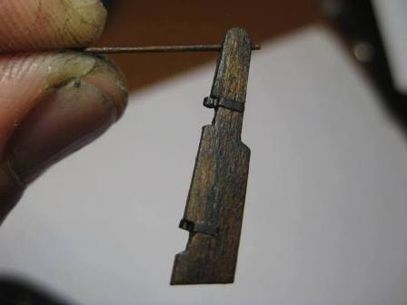 Кат-балка выполнена из ореховой рейки 4Х4 мм, предварительно согнутой над паром. Прорезь под шкив делал обломком ножовочного полотна по металлу, шкив попросил сделать из латуни токаря на работе.