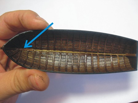 После обработки чистовой обшивки можно обработать киль и форштевень. Только в верхней части, где еще будет установлен буртик с весельными портами, обрабатывать еще рано. В это же время из ореховой лапши наклеиваем имитацию поворотного шпангоута в носовой части. Возможно, всего одного поворотного шпангоута и маловато. Помимо шпангоута на внутренней части форштевня и в носовой части киля я приклеил ореховую рейку (на фото она помечена синей стрелкой). Также на этом этапе я произвел первоначальную пропитку баркаса ореховым маслом. Я использую обычное ореховое масло, которое продают в супермаркете.