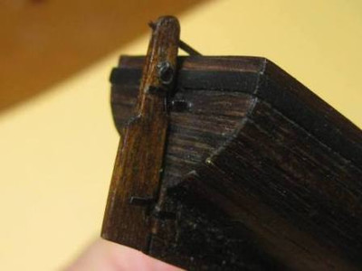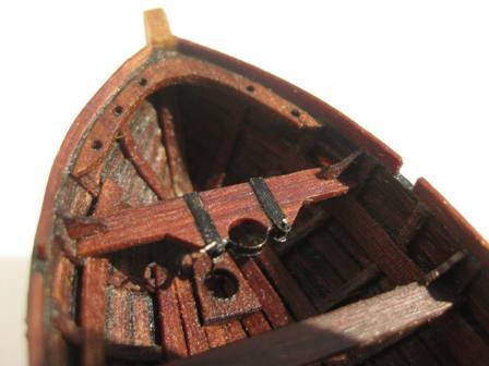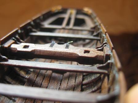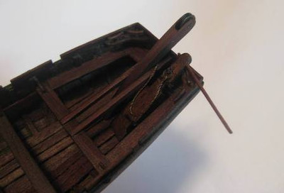 В кормовой части баркаса имеются “салазки”, которые предназначены для установки балки со шкивом. Это часть “оборудования”для операций с якорем. Салазки выполнены из реек квадратного сечения примерно 1 ммХ1 мм. Одна часть крепится к кончику ахтерштевня, другая – банке. В части, которая крепится к банке, нужно сделать паз.