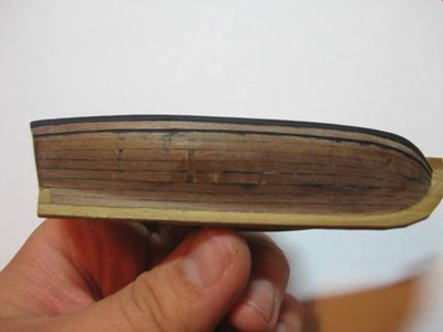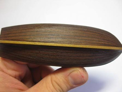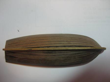 Теперь черновая обшивка. Все планки черновой обшивки и чистовой обшивки тщательно подгонялись, для чего зачастую приходилось изгибать их на ребро. Гнуть рейки на ребро несложно. Для этого я их смачивал горячей водой, клал на разделочную доску, изгибал пальцами. Естественно, что таким образом изогнутая рейка не лежит целиком в плоскости доски, а идет винтом, в одну плоскость рейка “загоняется” утюгом, включенным на полную мощность. Если изгиб большой, то процедуру нужно повторить несколько раз. Таким образом, рейке можно придать любую кривизну. Окончательно вырезается доска обшивки уже после изгибания рейки, тогда выполняется подгонка и делается необходимое зауживание. Торцы реек я подкрашивал черным звездинским акрилом тонко заточенной зубочисткой, чтобы подчеркнуть швы и имитировать конопатку. Эту процедуру я выполнял одинаково и на черновой, и на чистовой, так как черновая видна изнутри, а чистовая – снаружи. Когда баркас был целиком обшит начерно, снял его с матрицы. Черновую необходимо обработать. Допускается шпаклевание, если шпаклевка под цвет обшивки, но я обошелся без шпаклевки. При обработке черновой обводы баркаса выводятся окончательно.