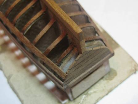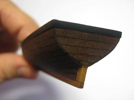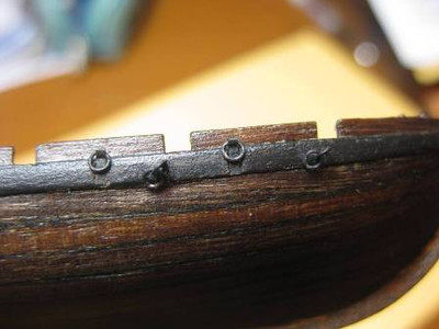 Буртик с весельными портиками изготовлен из планок ореха – остатков чистовой обшивки, толщина 0,5 мм. Я устанавливал его по частям, так что весельные портики образовались сразу. Я их не прорезал. Части бортика выполнял с запасом по высоте, затем отмечал карандашом верхнюю кромку и аккуратно обрезал запас, окончательно еще прошелся шкуркой.