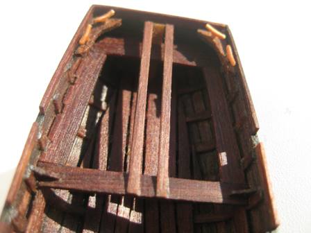 Работу над внутренним убранством начал с пайолов. Пайолы - единственный момент. который я позаимствовал с кита баркаса Баунти. Поэтому они выполнены неверно. Нужно было сделать имитацию кильсона. а пайолы выполнить составными. Также степсы нужно было устанавливать на кильсон, а не на пайол по центру. Пайолы изготовлены из орехового шпона - остатков чистовой обшивки. их также необходимо гнуть на ребро посредством утюга. Чаки (на которые опираются банки) также изготовлены из орехового шпона, оставшегося после чистовой обшивки. степсы на фото ниже пока не сделаны. их я изготовил из остатков черновой обшивки - реек ореха 1,5Х6 мм. Делая их. я ошибся: отверстие в степсах должно быть квадратное, а не круглое.