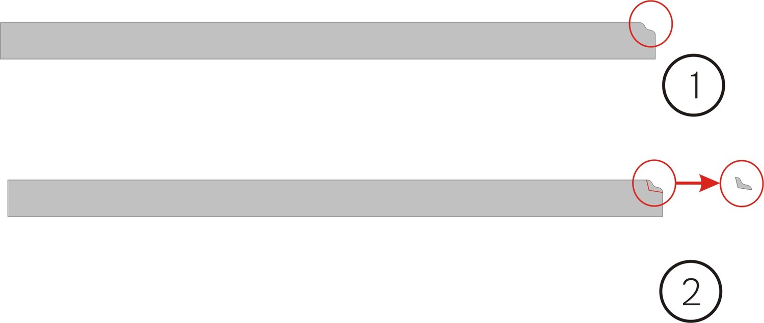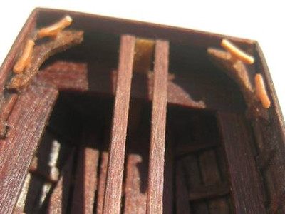 Кницы на банках выполнены из ореха. Брал рейку черновой обшивки, стачивал ее примерно до 0,7 мм. Затем “поливал” суперклеем с двух сторон, чтобы суперклей пропитал планку. Дождавшись, когда клей подсохнет, шкуркой снимал клей с обеих сторон, соответственно толщина планки уменьшается примерно до 0,6 мм. После такой обработки орех колется гораздо меньше и по свойствам при обработке напоминает грушу. Нужно дать клею как следует высохнуть (он уже внутри, пропитал рейку), примерно сутки. Тогда можно приступать к работе по вырезанию книц. Здесь важна последовательность действий. Сначала нужно вырезать внешний контур кницы (шаг 1) посредством ножика и надфиля, затем аккуратно лезвием отделить кницу (шаг 2). Остается лишь установить кницу на место посредством секунды-геля. На модели Пучкова кницы на банке, на которой выполнено крепление грот-мачты, двойные.