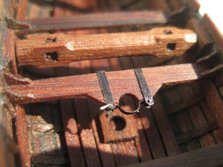 Крепления вант – полоски латуни. Часть, в которую вставляется кольцо, сгибал на проволока 0,5 мм, излишек отрезал резаком, спаивал кончик ушка, потом продевал кольцо и спаивал кончики кольца. Под само крепление делал пар в бархоуте. Так, что крепление немного получается утопленным. Для надежности.