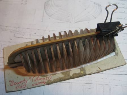 Теперь шпангоуты. Они выполнены из “лапши” ореха (остатки планок обшивки корпуса), ширина которой примерно 1,5 мм. Будущий шпагоут клеится к матрице, туда, где сделан запас по высоте, затем, после высыхания клея, будущий шпангоут смачивается просто мокрым пальцем, берем утюг с тупым носиком и “обворачиваем” картонный шаблон. Дерево точно повторяет его форму при нагревании, причем таким способом его можно выгнуть в двух плоскостях, так как с некоторых шпангоутов малка снята довольно сильно. Затем излишек у киля обрезается и кончик шпангоута вставляется в паз. Где фиксируется капелькой клея. На куттере я эту технологию также изменил на более удобную, о чем будет сказано ниже. На фото представлен процесс: