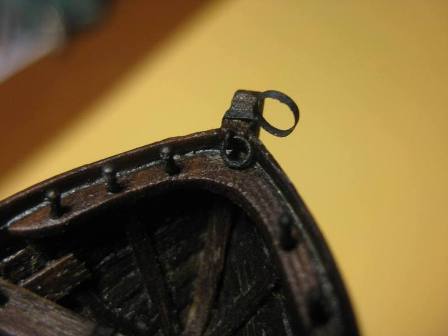 Законченный вид и насыщенность деталями шлюпке придают многочисленные металлические элементы: крепление бушприта, элементы дл крепления вант, рымы с кольцами, крепление руля.