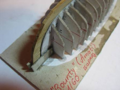 Отмечу, что особенно важно сделать большой припуск на штевнях для крепления к матрице (отмечено красными стрелками). Я крепил при помощи картонных накладок. Важно не допускать попадания клея в ту часть киля и штевней, которая после обрезки будет снята с матрицы. Также для улучшения извлечения матрицы, хорошо бы натереть все торцы шпангоутов и килевой рамки парафином или воском. Даже, если клей попадет туда, куда не следует, снимется скорлупка все равно легко. Однако, нельзя заходить при натирании за красную линию, обозначающую бортовую линию, иначе не приклеятся выступающие части шпангоутов, которые при снятии с матрицы обрезаются.