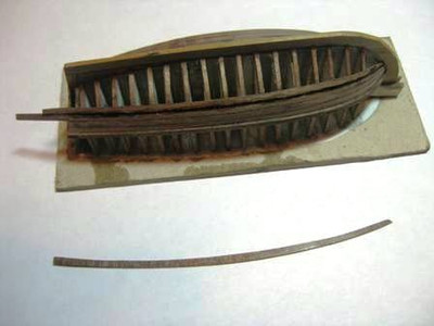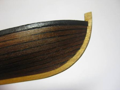 Сначала я выполнил ширстрек, в носовой части которого пришлось сделать вырез для того, чтобы вставить его в заранее заготовленный паз в ахтерштевне. Так как для этого использовалась более толстая планка, о котором говорилось выше. Изгибал планку при помощи пара. Так как в носовой части паз надежно фиксирует рейку, установка не представляет особых проблем. Нужно лишь точно следовать красным отметкам, обозначающим бортовую линиюа на матрице и фиксировать ширстрек капельками суперклея на шпангоутах.
