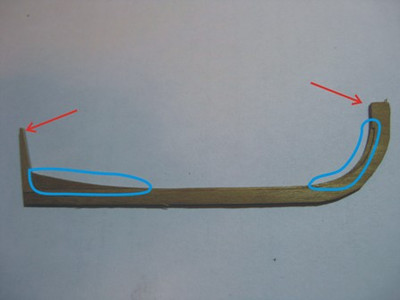 Теперь можно приступать к реализации баркаса в дереве. Первый этап – шпангоуты и киль со штевнями, транец. Чертёж киля с намеченными пазами под шпангоуты, а также штевнями в кореловском файле. Я наклеивал отпечаток на лист двухмиллиметрового орехового шпона ( вои здесь как раз использовал дешевый клей-карандаш, чтоб легко снять бумагу), предварительно пропитав его суперклеем, иначе колется, затем вырезал с запасом “наружу”. В тех частях, где киль и штевни прилегают к матрице, нужна точная подгонка, а вот внешние части я обтачивал гораздо позже, подгоняя по готовой скорлупе. На кореловском файле намечена линия, по которой я делал паз. Она намечена по всей длине. На баркасе паз делал с обеих сторон киля и форштевня, паз глубиной примерно 0,5 мм. Однако, сделать это стоило бы только в носовой и кормовой части. Эти места на фото я обвел синим.