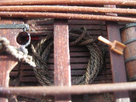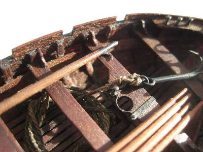 Несколько слов о бухте троса. Делал я бухты следующим образом: брал толстый маркер, оборачивал вокруг него несколько витков троса, предварительно пропитанного жидко разбавленным ПВА. После снятия бухточки с маркера клал под пресс на сутки. Только после этого привязывал якорь, рассчитывая длину от бухты до якоря по длине. Фиксировал бухту капельками суперклея-геля.