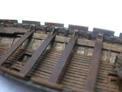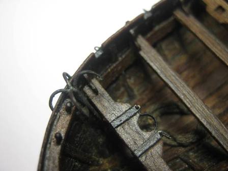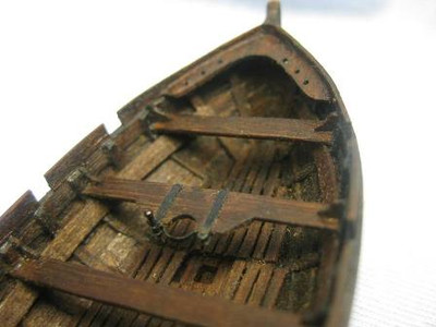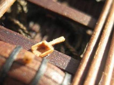 наполнении куттера следует отметить, что по-иному выполнены пайолы и степс. Степс имеет квадратное отверстие (учел справедливое замечание на одном из форумов), а пайолы выполнил по образцу куттера Пучкова, установив сперва поперечные планки, которые закреплены к шпангоутам, затем настелив продольные планки из лапши ореха шириной 1 мм. Пайолы выполнены составными. Под степс предусмотрено отверстие, еще одно отверстие для гака гика-шкота.