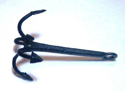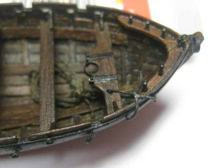 При наполнении шлюпок необходимо учесть, что баркас установлен под куттером и на готовой модели его наполнения не будет видно. Именно поэтому из всего оснащения баркаса присутствует лишь якорь-кошка с бухтой троса. Таким же якорем оснащен и куттер. Такие якоря стандартно входили в оснащение шлюпок. Изначально я планировал изготовить их из счетверенных рыболовных крючков подходящего размера. Однако такие крючки не очень подходят для этой цели. Так как лапы имеют неподходящую форму, неважно подаются обработке. При попытке обточить, я чуть было сильно не поранил руку и сломал две “лапы”. Кроме того, веретено получилось бы слишком толстым, да и вообще видно немодельное происхождение якоря, на шлюпках выглядело бы инородным телом. Поэтому было принято решение изготовить якоря самостоятельно. Оба якоря делались в разное время, из разных материалов и последовательность работ также отличалась. Поэтому опишу как я делал оба.