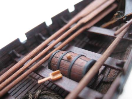 Анкерок в первый раз для себя делал при помощи электрики. Как я делал бочки раньше описано в обзоре постройки галеона Сан Мартин. Способ не быстрый. На этот раз я брал круглую заготовку 8 мм в диаметре, зажимал ее в патроне электродрели, которую клал на рабочий стол, надфилями и наждачкой придавал части рейки форму бочонка, затем отрезал заготовку анкерка куском ножовки по металлу при вращающейся дрели. Буртик со стороны дна бочонка делал гравером, точнее гибким валом при помощи фрезы – диск 5 мм. Далее карандашом намечал стыки досок, слегка прорезал их ножом и выделял стыки остро отточенным карандашом. Обручи выполнены из полосок черного ватмана. Он превосходно клеится на суперклей, а стык потом зачищается шкуркой и становится совершенно незаметен. Пробка – зубочистка, под нее нужно просверлить отверстие. Анкер-блоки из ореха, причем сначала я их закрепил на анкерке. Потом установил в куттер. На все про все ушло не более часа. Результат на фото.