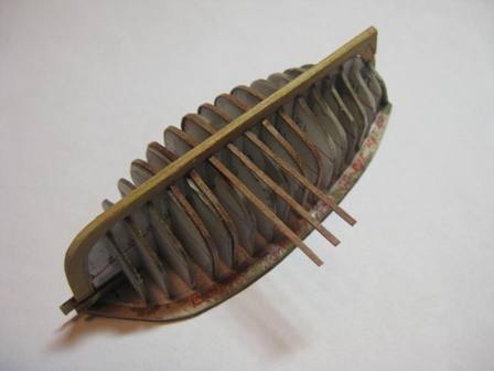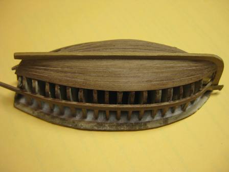 Устанавливал так не все шпангоуты. Несколько шпангоутов в носовой и кормовой части установлены аналогично способу, примененному на баркасе. Килевую со штевнями устанавливал на матрицу уже с приклеенными заготовками шпангоутов. После закрепления на матрице смачивал шпангоуты водой и посредством утюга огибал картонные шпангоуты матрицы, фиксируя кончики, лежащие над бортовой линией суперклеем.