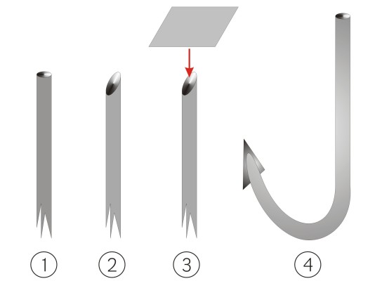 При изготовлении наконечника отпорного крюка я остановился на следующем способе: взял кусок медной проволоки, подходящей по диаметру (1 мм). Немного высверлил изнутри для крепления на “черенок” и приклеил его к круглой заготовке диаметром 3 мм, немного заточив ее на конце. Когда клей хорошо просох, зажал заготовку в гравере и придал медной заготовке форму конус. Кончик не должен быть острым. Затем согнул кусочек медной проволоки меньшего диаметра и припаял ее к конусу, обработал. Снимать не потребовалось, так как при пайке будущий наконечник отпорного крюка отваливается сам. Суперклей боится высокую температуру. Затем надел его на ореховый “черенок” диаметром 1 мм и покрыл его маслом.