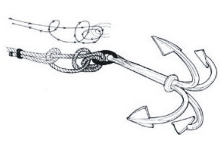 Последний этап – кольцо. К которому привязывается якорный канат. Его я выгнул на надфиле из мягкой медной проволоки. Держать его проблемно, поэтому пошел на хитрость. Кольцо является незамкнутой окружностью. Она разомкнута ровно настолько, сколько нужно, чтобы втиснуть туда кончик веретена. Веретено должно входить плотно, чтобы кольцо держалось без контакта с ним на кончике веретена. Остается окунуть в паяльную кислоту и капнуть на место стыка припой. Затем обтачиваем и якорь практически готов. Чернил также, как и все остальное. Остается привязать канат якорным узлом, как на этой схеме:
