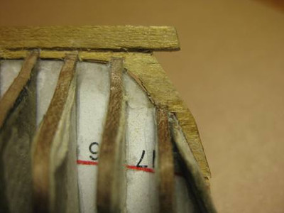 Так как куттер, в отличие от баркаса. Имеет клинкерную обшивку, то начинать ее следует со шпунтового пояса. Клинкерная обшивка всегда одинарная. Поэтому нуждается в особо тщательной подгонке. Также следует иметь в виду особенность клинкерной обшивки – в районе ахтерштевня. Транца и форштевня нахлест сходит на нет. Для достижения этого с законцовок поясов обшивки я снимал фаски, фаски снимал с обоих поясов в носу и корме для лучшего прилегания.